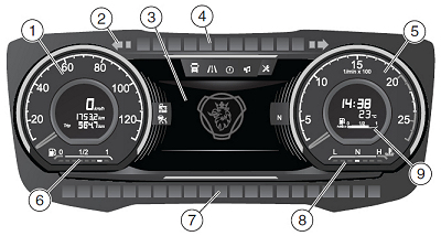 - Displej vpravo zobrazuje hladinu redukčního činidla, venkovní teplotu a hodiny.