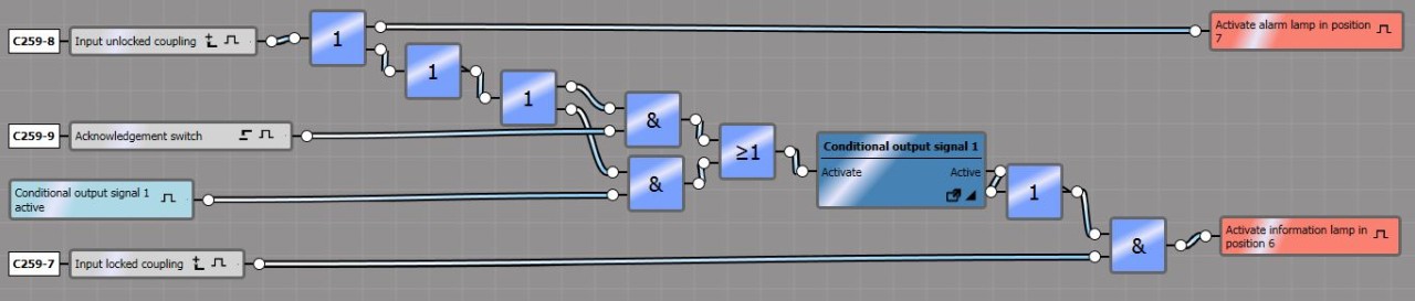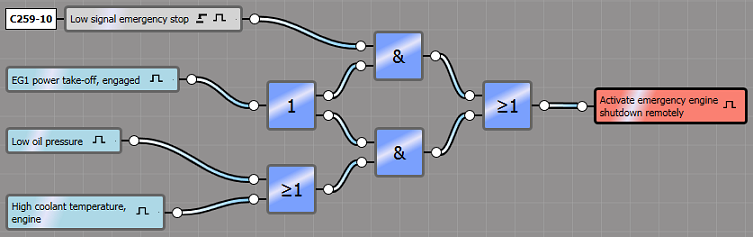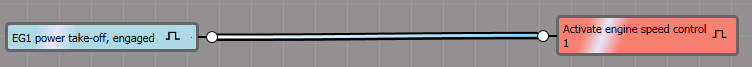 The following logic diagram makes it possible to increase the engine speed to a preset value. When the EG power take-off is connected engine speed 1 will be activated.