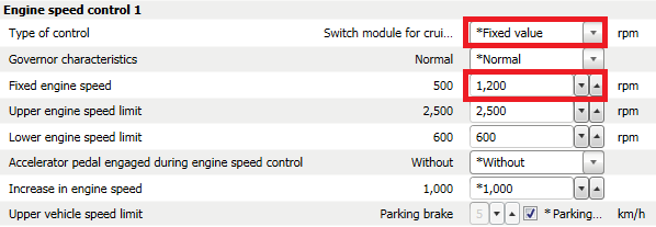With this function, the engine speed can be increased to a preset value with different conditions, for example with a power take-off engaged, as shown in the example below.